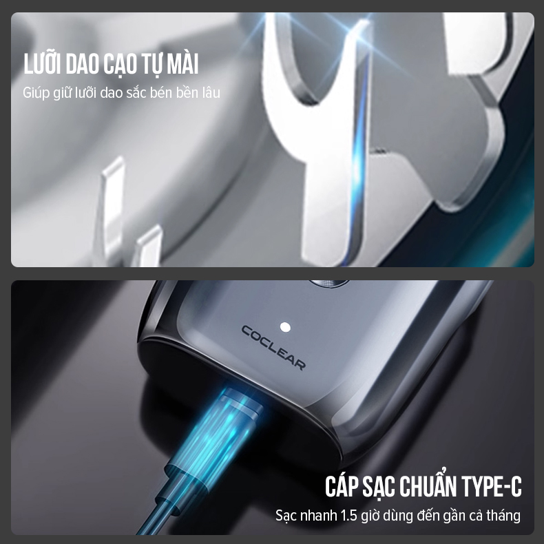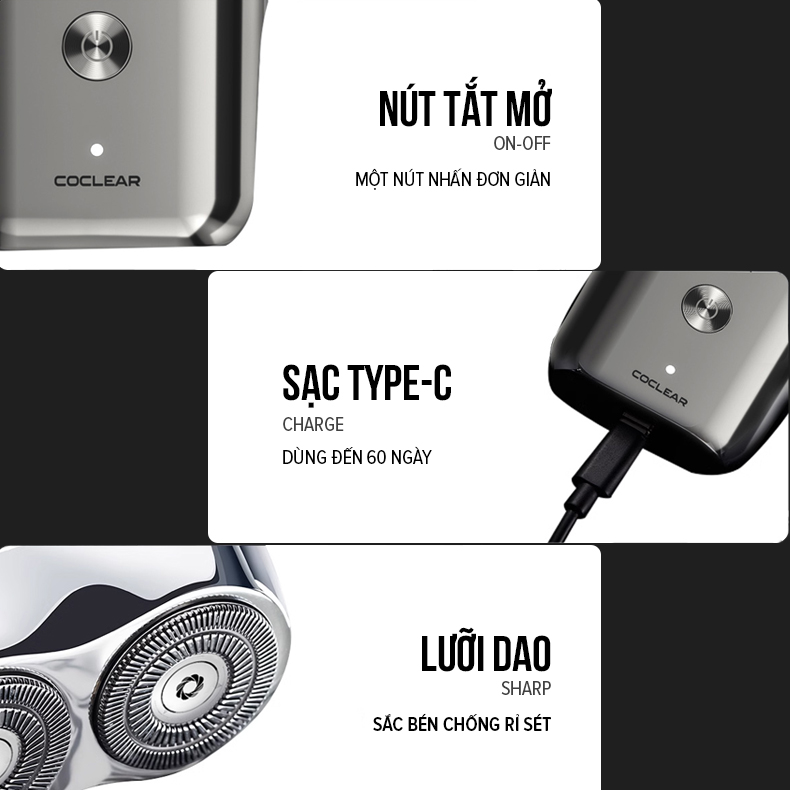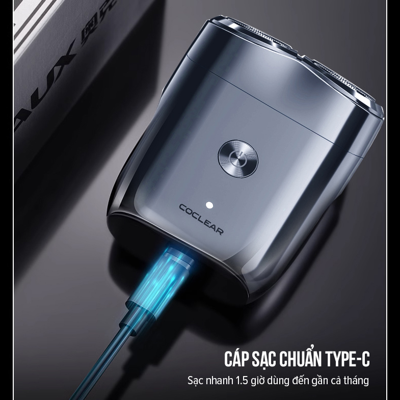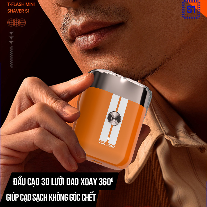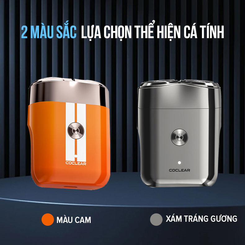 Máy cạo râu MiNi COCLEAR có thiết kế nhỏ gọn với 2 màu cam và xám tráng gương cá tính năng động. lDòng máy cạo râu mini này đích thị là tình yêu đích thực dành cho các bạn trẻ năng động dễ dàng sử dụng mọi lúc mọi nơi, nhiều tính năng vượt trội tiên tiến với cáp sạc USB type-C, khóa du lịch, cắm sạc dùng ngày. Mang đến trải nghiệm vượt bậc giúp việc cạo râu trở nên thoải mái hơn bao giờ hết.